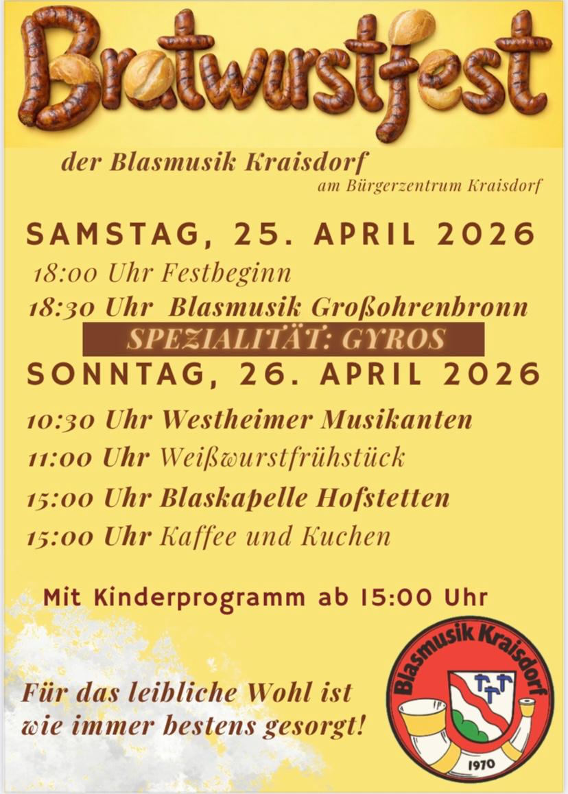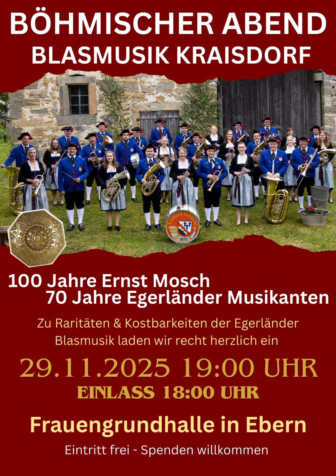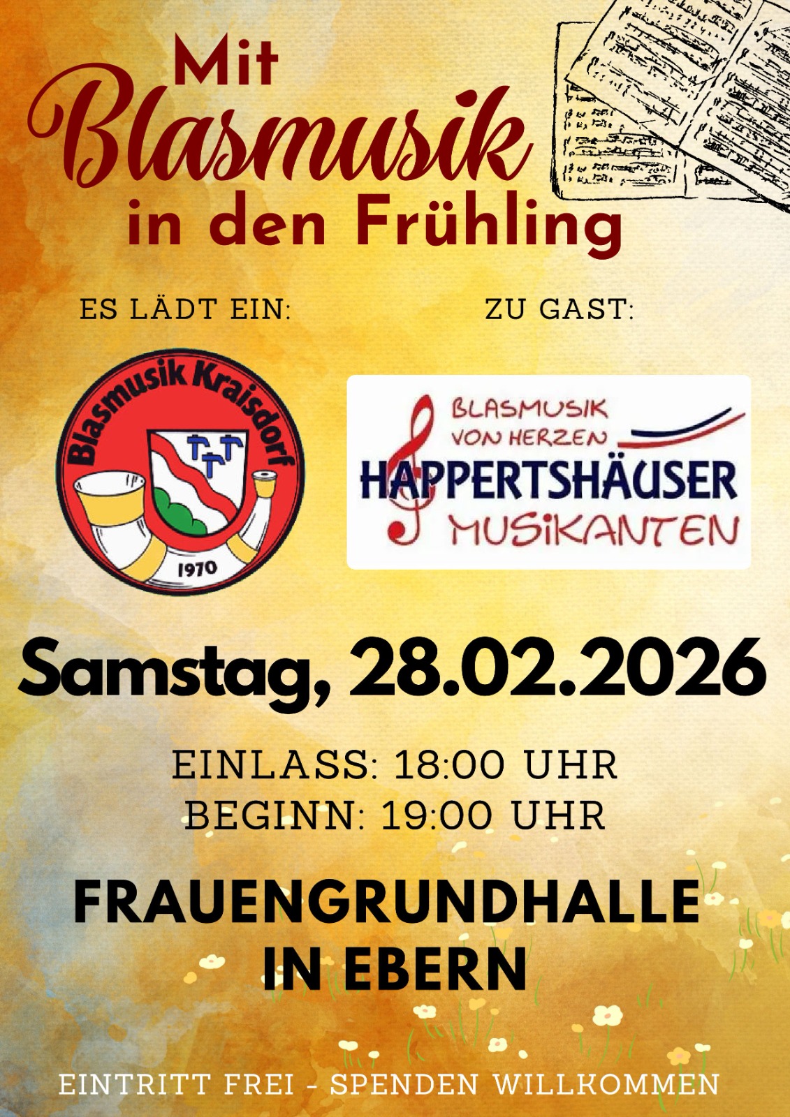 8.3.2025 – Frühjahrskonzert 2025 9.11.2024 – Böhmischer Abend 2024 9.3. 2024 – Frühjahrskonzert 2024 4.11.2023 – Böhmischer Abend 2023 14.5.2023 – Jubiläum einer langen Partnerschaft – Baum gepflanzt 4.3.2023 – Gerhard Eller zum Ehrenbürger der Gemeinde Pfarrweisach ernannt 4.3.2023 – Frühlingskonzert der Blasmusik Kraisdorf in der Frauengrundhalle Ebern – Gastkapelle war die Original Atlmühltaler Blaskapelle Beilngries Die Blasmusik Kraisdorf beim Nordbayerischer Musikbund Unsere nächsten Termine: